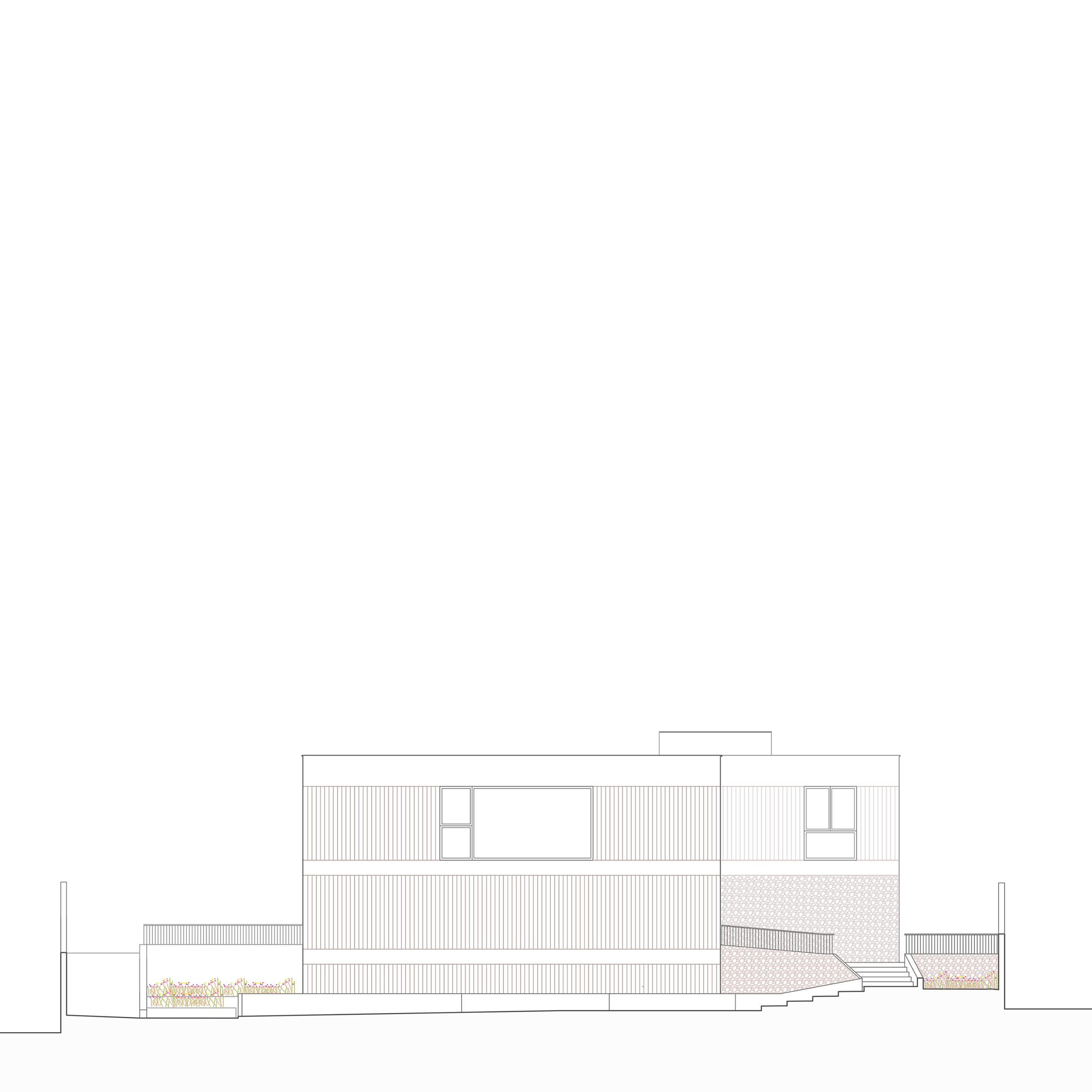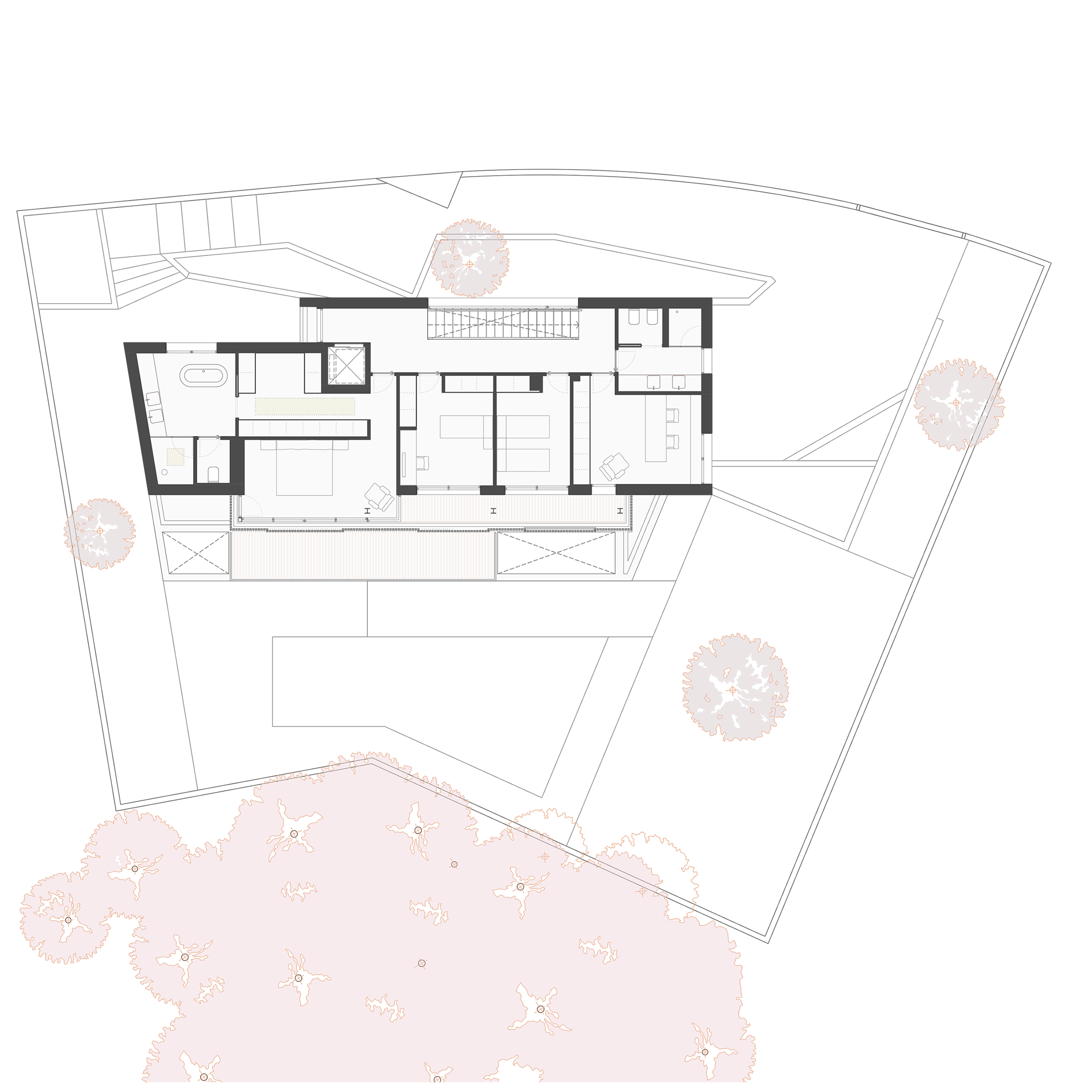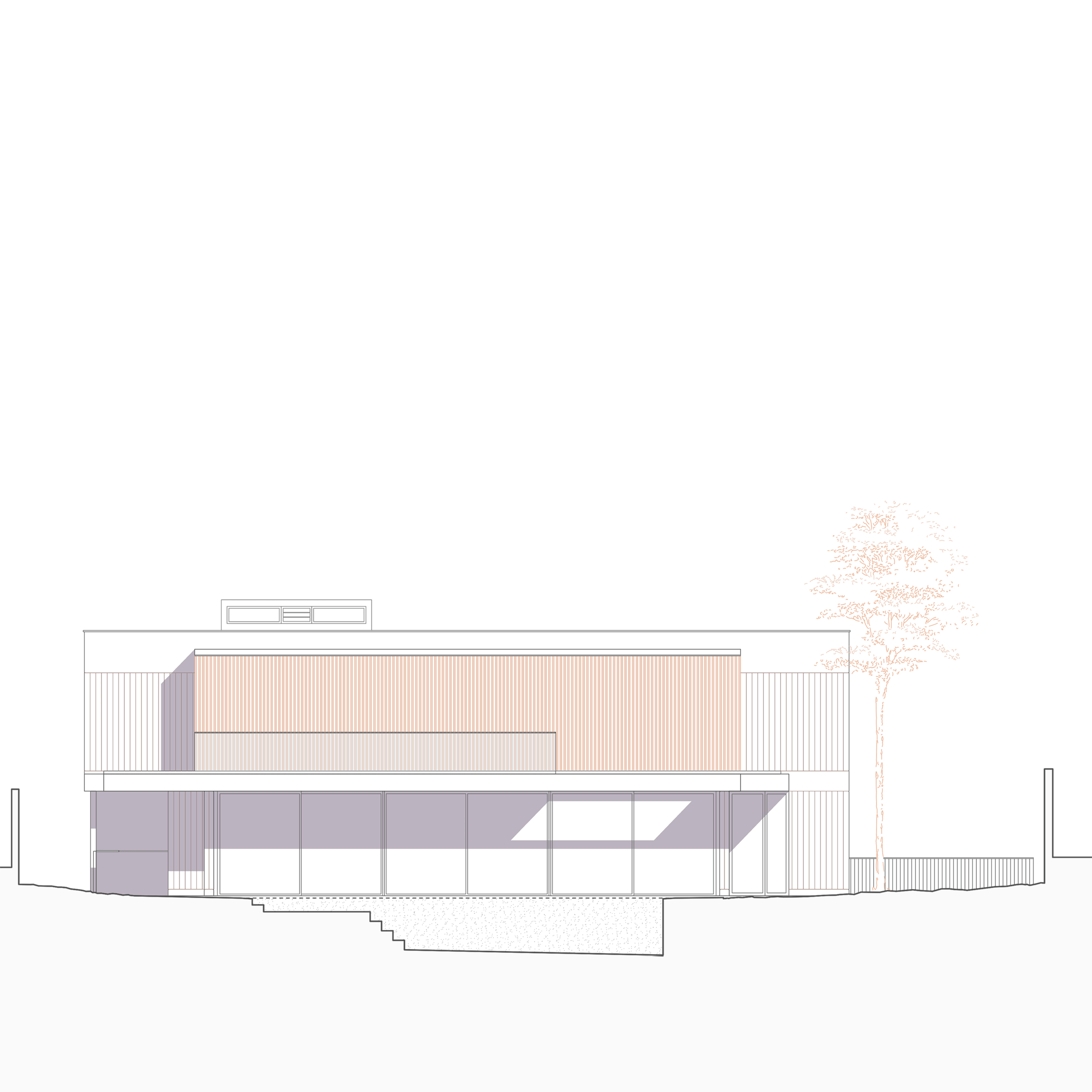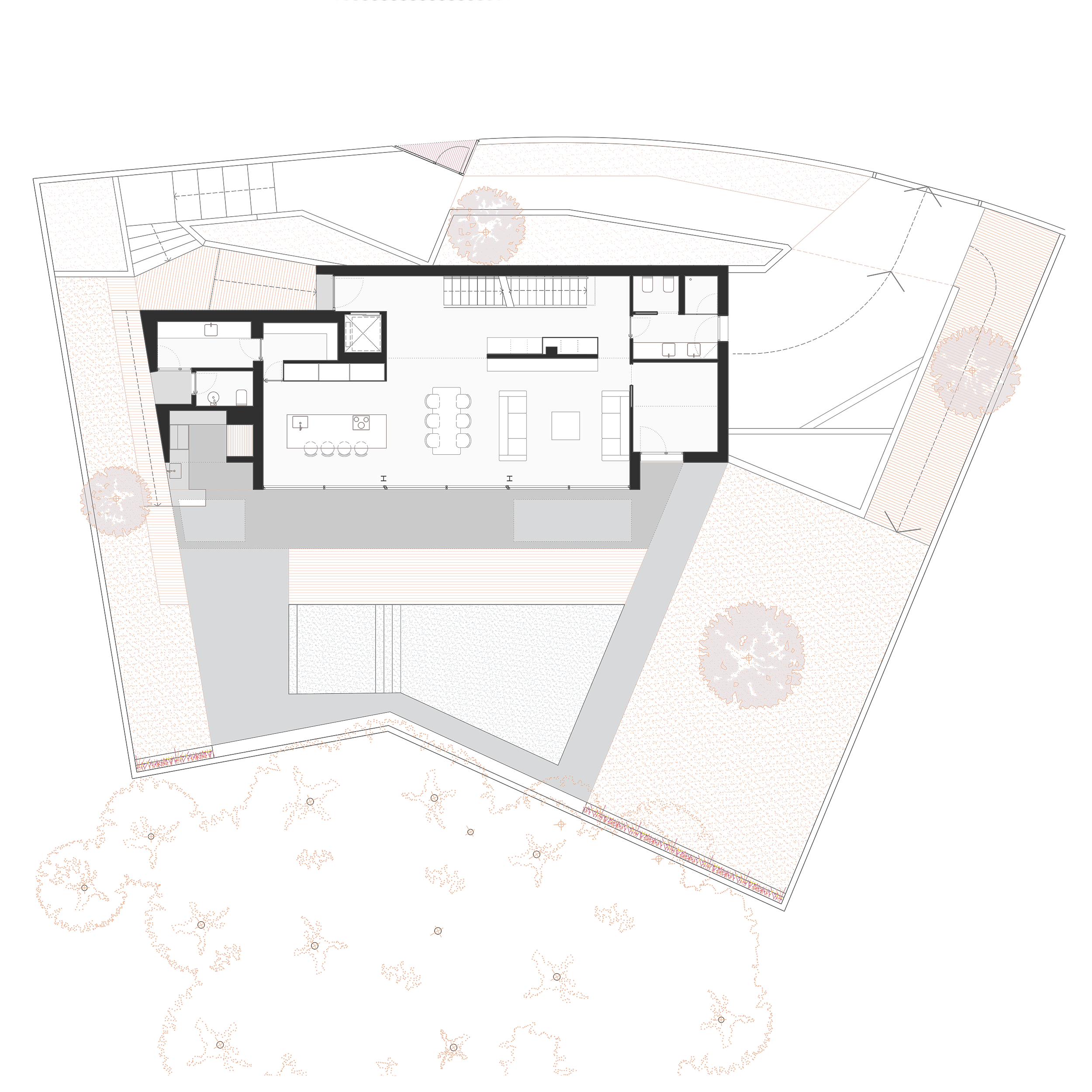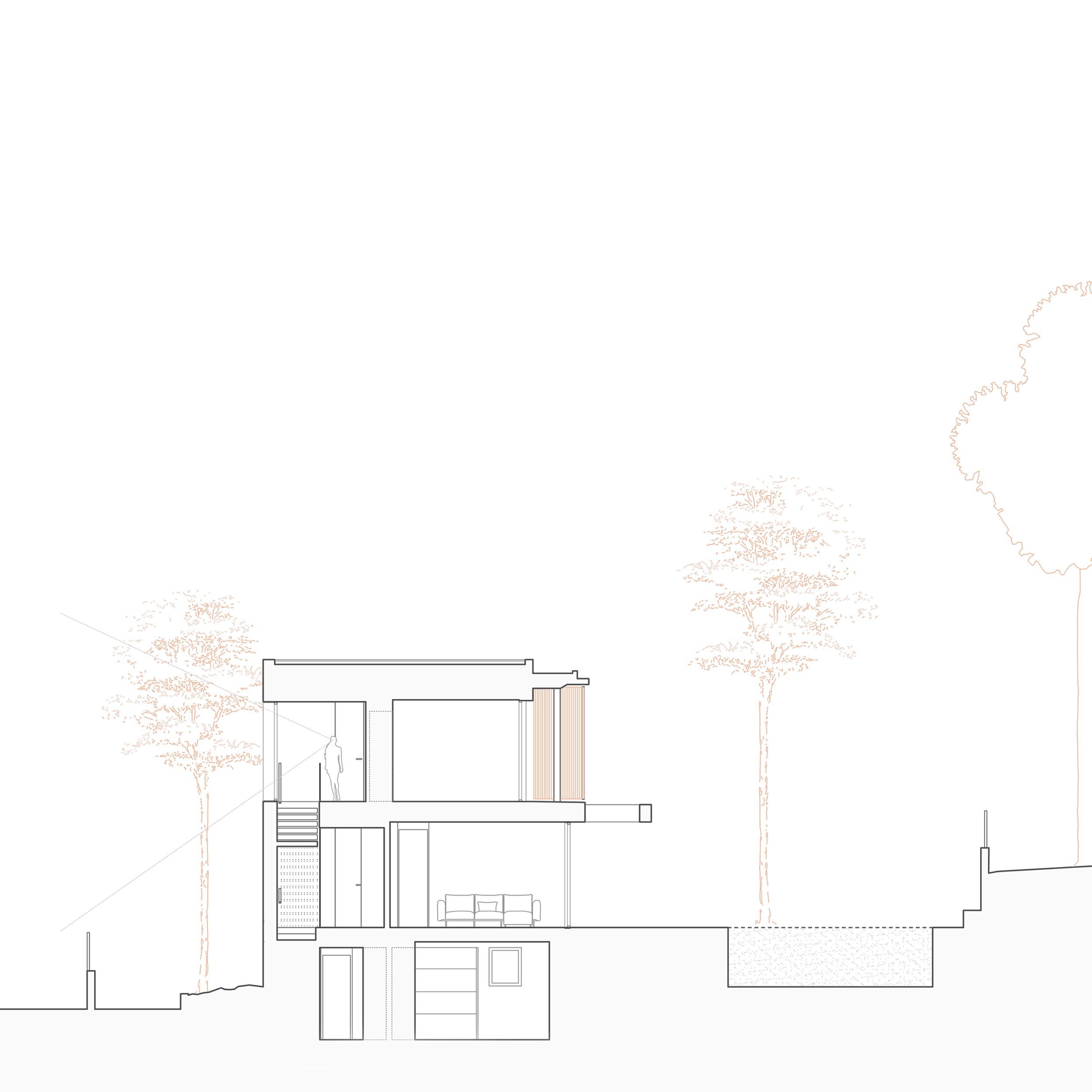 La propia parcela cuenta con un desnivel muy fuerte proveniente de la pinada originaria. La vivienda se ubica en la parte central del desnivel, consiguiendo un zócalo sobre el que se desarrolla la planta de pública.