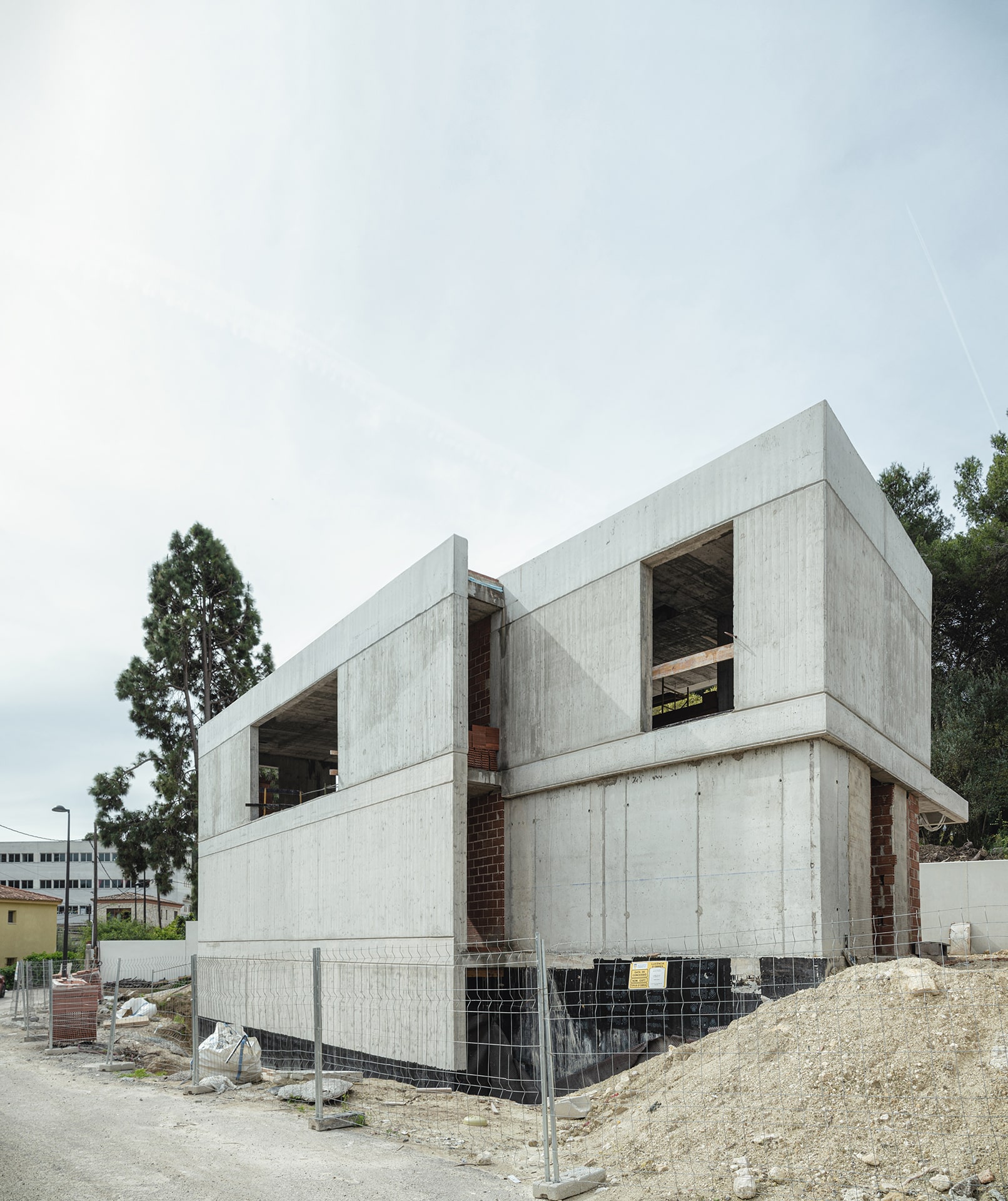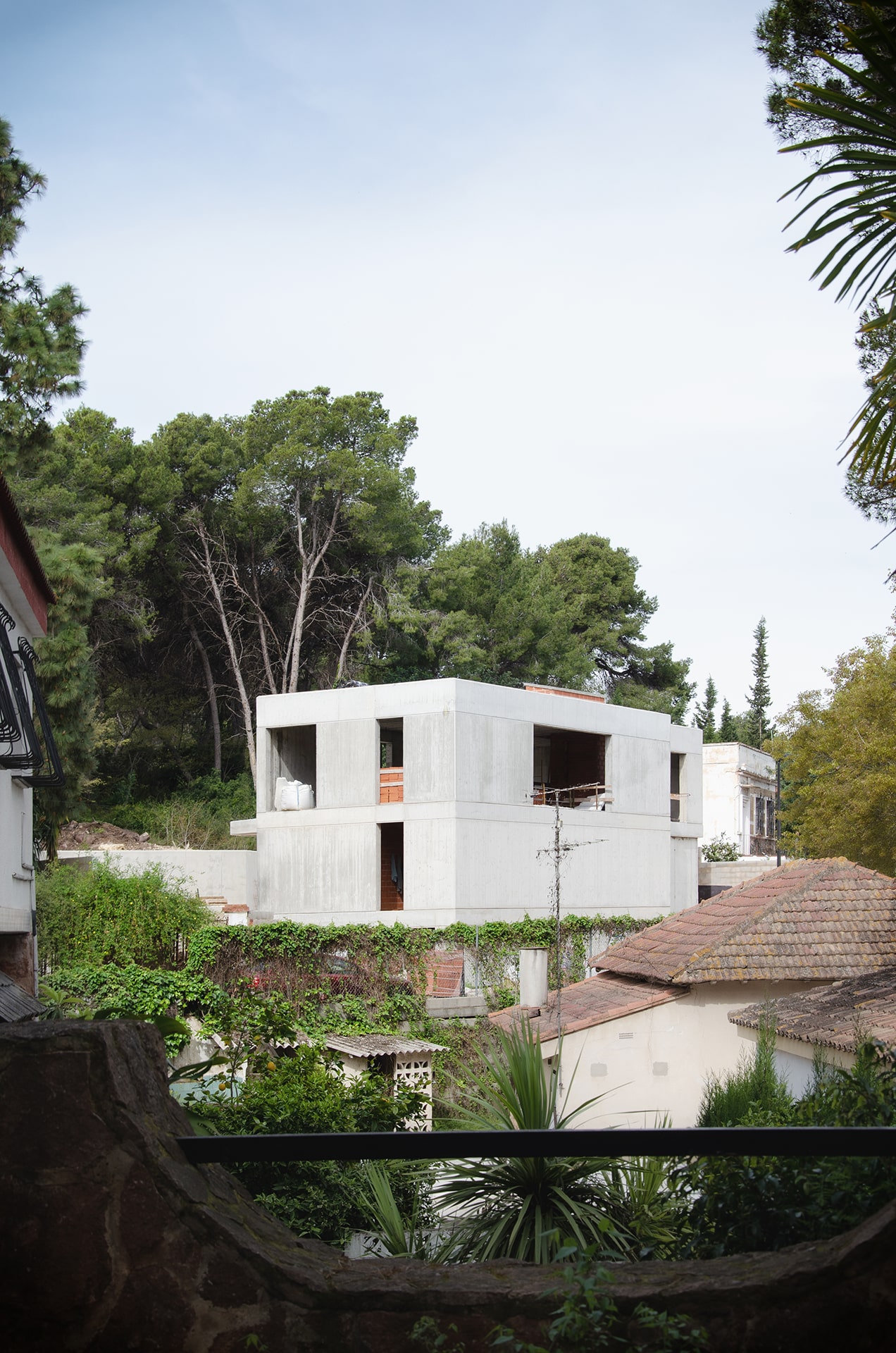 Se formaliza como un prisma muy regular, macizo y prominentemente vertical como respuesta al entorno de viviendas con cubiertas a cuatro aguas y de carácter más tradicional. En el sur, como respuesta a la verticalidad aportada por la pinada la vivienda se desarrolla en bandejas horizontales que se adaptan a las directrices de la parcela y se abren completamente a este espacio.